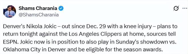 掘金重大利好!约基奇今日将复出对阵快船 暂未失去评奖资格